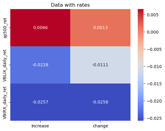While some of the analysis we gathered supported our initial assumptions, it’s clear that we have to reject our hypothesis after looking through the data and visualizations. While there were moments in the graphs where the increase in a rate led to a decrease in returns, the relationship was not linear and experienced too much volatility to consider a serious finding. While we still believe that this relationship exists, especially when looking at stocks, it’s clear that we need to include more samples in our data as well as look at the data from different viewpoints. One phenomenon that we observed that did back up our assumptions was that the s&p 500 index was significantly more volatile in the periods we were analyzing than either of the two bond indexes. This makes intuitive sense as bonds are a lot less liquid and people generally like to hold onto their bonds for longer. One suspicion our group has based on the graphs we saw was that people are more likely to speculatively buy a stock they think is going to go up, then they are to sell a stock they already own. People are much more likely to believe that the stock they are choosing will be a winner versus admitting to themselves the stock they own is a loser. Not only does this make sense psychologically, but the data backs this assumption up reasonably well. One idea we had for improving our analysis would be to create a categorical variable with 4 bins: small hike, large hike, small decrease, and large decrease. This would give us the ability to look at the returns in relation to the size of the increase versus just the average. Another idea for improving the study would be to separate the meeting dates and rate hikes into seasons or periods of the year. This would allow us to extract the true correlations versus returns that were shifting strictly because of season or market patterns.